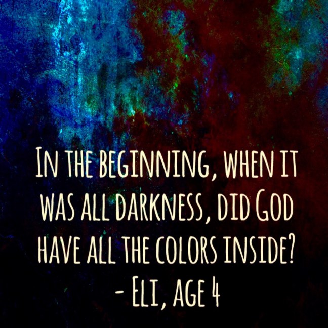 A few weeks ago, a pastor-friend shared a question that her four-year-old-son had asked on Facebook: In the beginning, when it was all darkness, did God have all the colors inside?